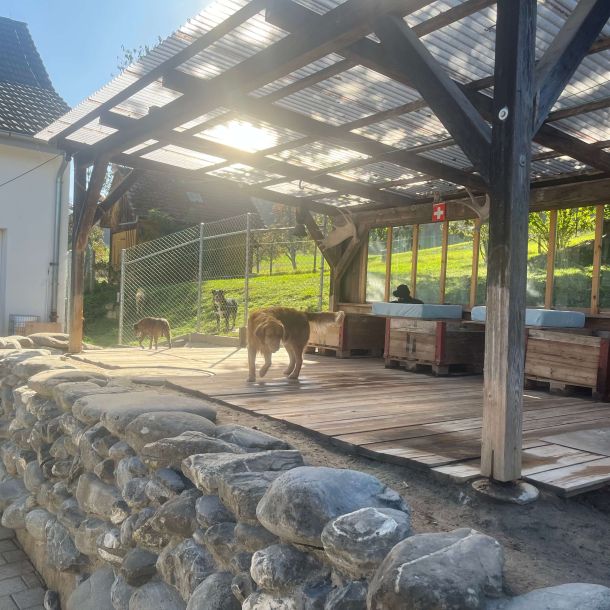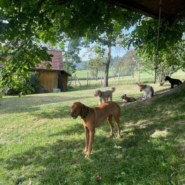 beinhaltet Familienanschluss, Spaziergänge, ganztägiger freier Zugang zum Wohnhaus und eingezäunten Garten, Gruppenhaltung, Fellpflege, 2 Fütterungen.
